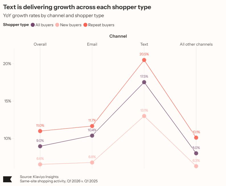 This analysis examines same-site shopping and marketing activity across a stable cohort of top GMV-producing Klaviyo customers during Q1 2026, compared to the same period in 2025. All data is anonymized and aggregated. Text insights are global and reflect Klaviyo customers sending text in both 2025 and 2026. All financial figures are in USD. All data is approximate, unaudited, and subject to adjustment.