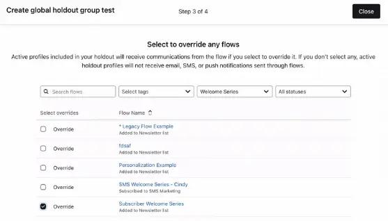While a global holdout experiment is running you will be able to override a holdout group to send any campaign or flow without interrupting the test. Ideally, overrides should only be used for sending non-marketing communications in order to determine the most accurate lift generated by email, SMS, and push marketing.