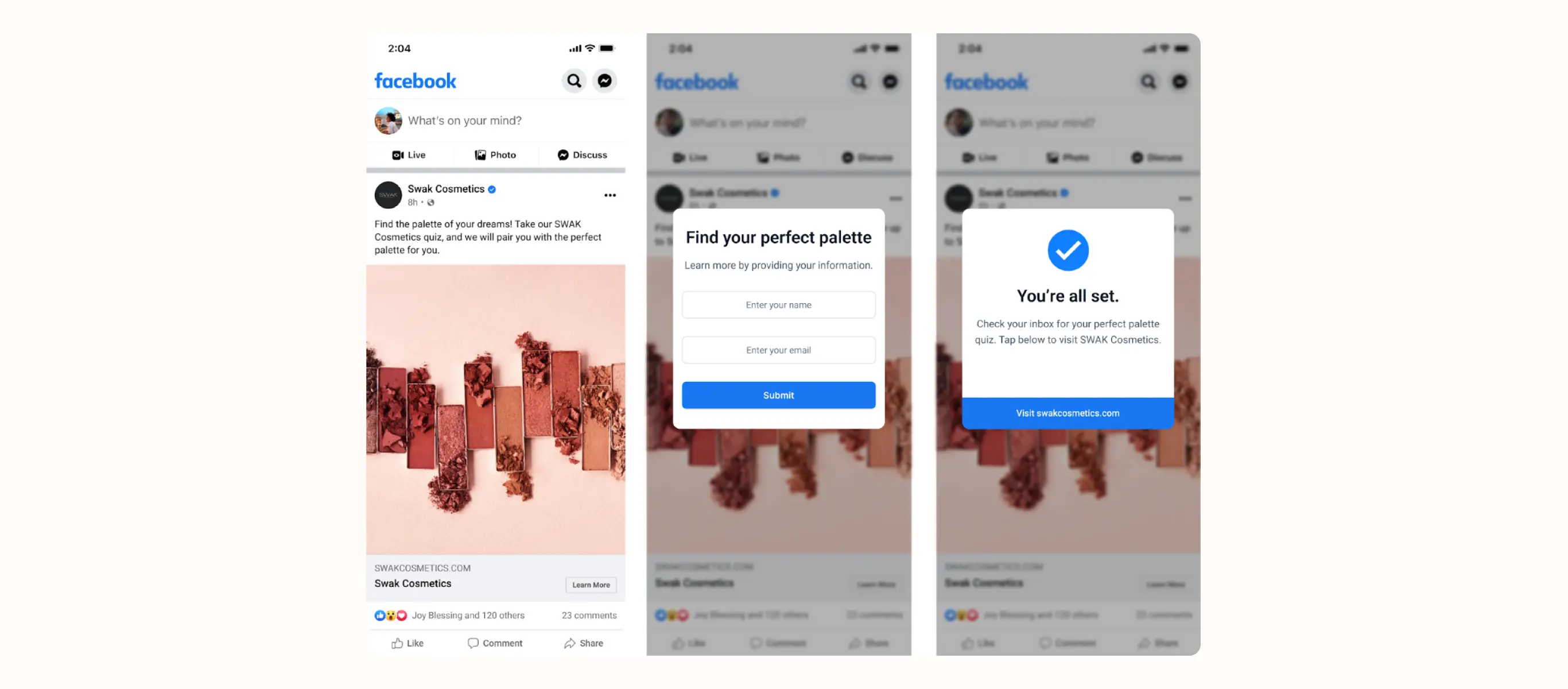 For example, SWAK Cosmetics ran a lead ad that included a lead magnet called Color Family Quiz. This quiz asked shoppers to specify the colors they usually wear, types of events they usually attend while wearing makeup, and types of products they typically use. The brand’s welcome series flow included the following elements: