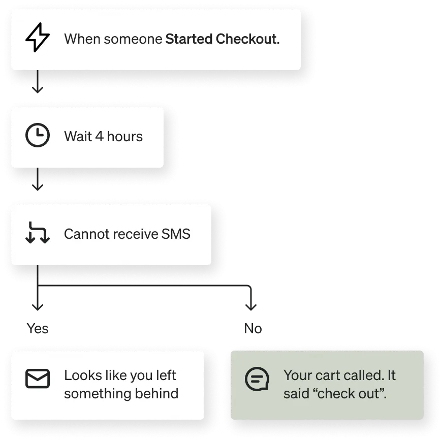 Keep the customer experience in mind and use SMS for time-sensitive messages that encourage subscribers to take a clear action. For these retention flows, you should test different configurations of email and SMS to see what works best with your customers. A/B test 2 flow branches: 1 where you lead with SMS and follow up via email, and 1 where you lead with email and follow up with an SMS.