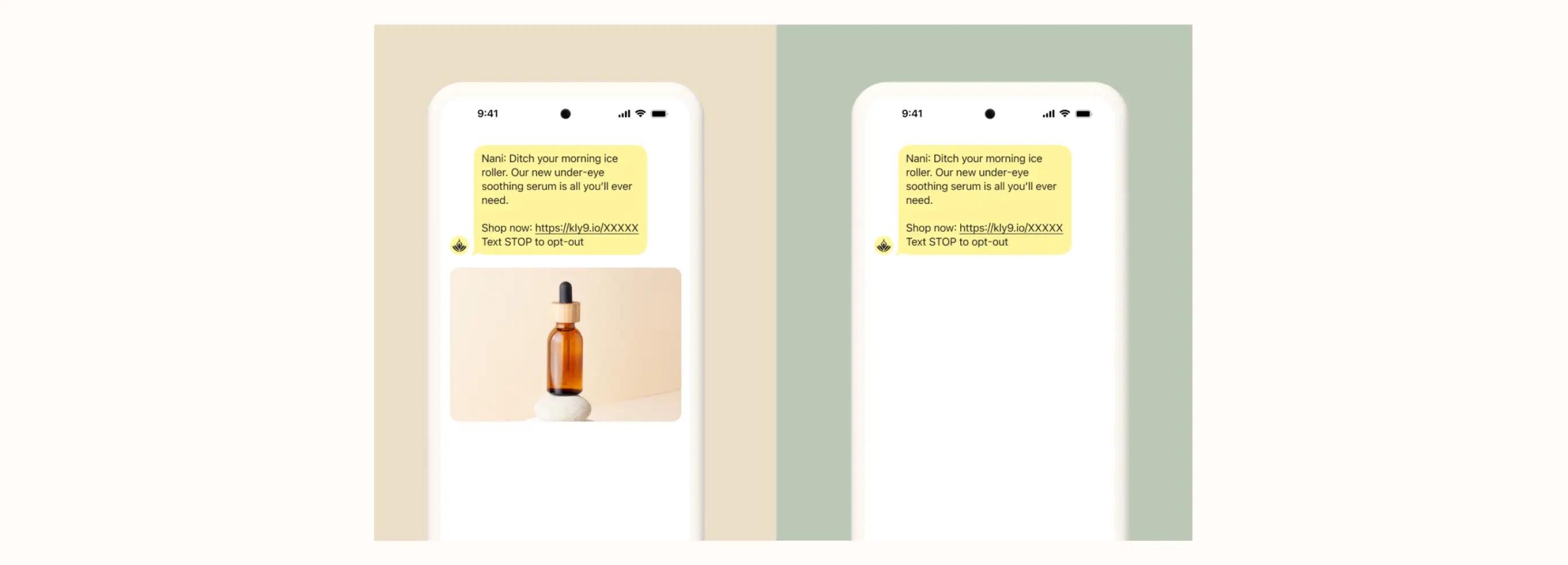 SMS stands for short messaging service, while MMS stands for multimedia messaging service. We’ve found that SMS messages typically perform the same or better than MMS messages (texts that also contain an image, gif, or video). While this isn’t always the case, 95% of A/B tests run in Klaviyo show that SMS outperforms MMS.