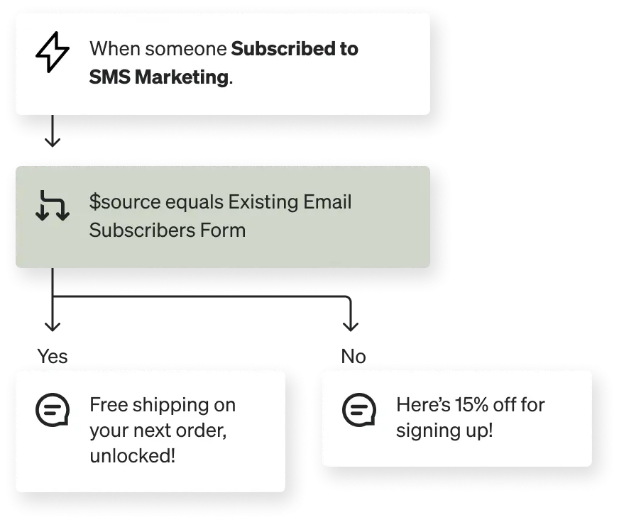 - Conditional split: Split the flow by the $source profile property to account for any difference in incentives that you might have between your “new visitor” form and “existing email” form. For instance, you may offer 15% off to new visitors for SMS consent, but free shipping to existing email subscribers if they sign up for SMS. Branching based on sign-up form source allows you to deliver on these different incentives within a single flow.
