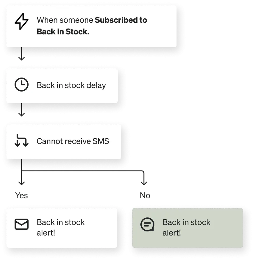 Back-in-stock flows automatically notify people who specifically subscribe to updates for when a particular product is back in stock. Sending these contacts an SMS message in addition to an email can help increase conversion rates because of the time-sensitive nature.
