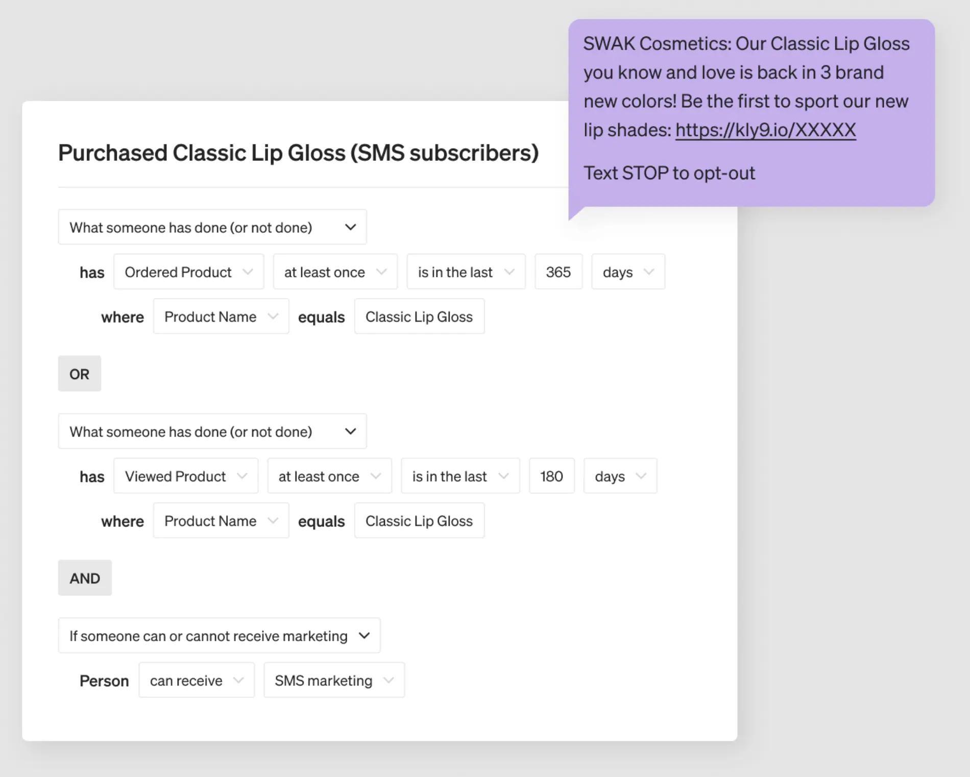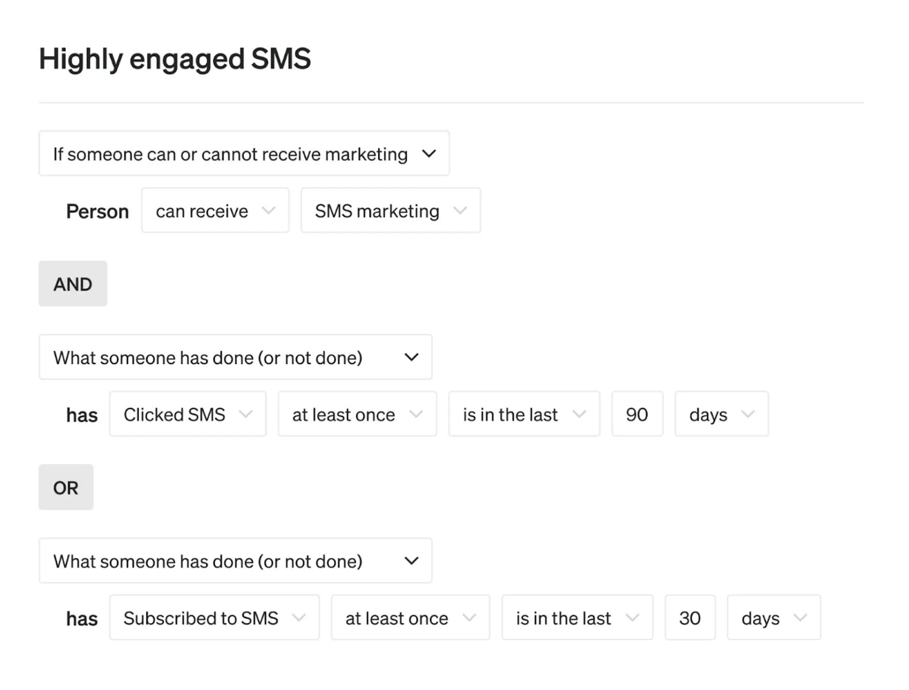 Similar to email, your SMS campaigns should target a variety of segments. In other words, you should not send every SMS campaign to every single SMS subscriber. If you continue to send messages to profiles who consistently do not click on them or take any action, your list will decay over time and you will waste money contacting profiles who are not likely to buy.