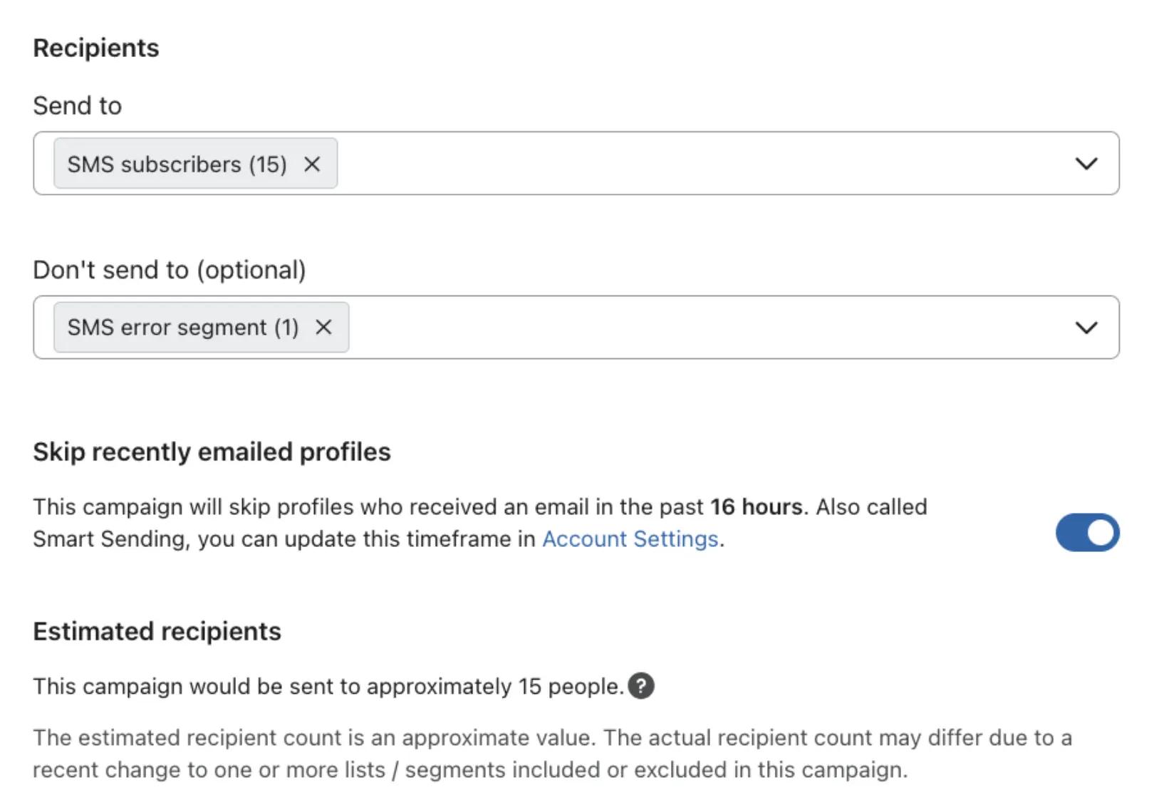 Make sure that Smart Sending is turned on for all SMS messages in your flows (exceptions to this are outlined below). This feature helps you avoid over-messaging subscribers with texts, which in turn helps you control your unsubscribe rate.