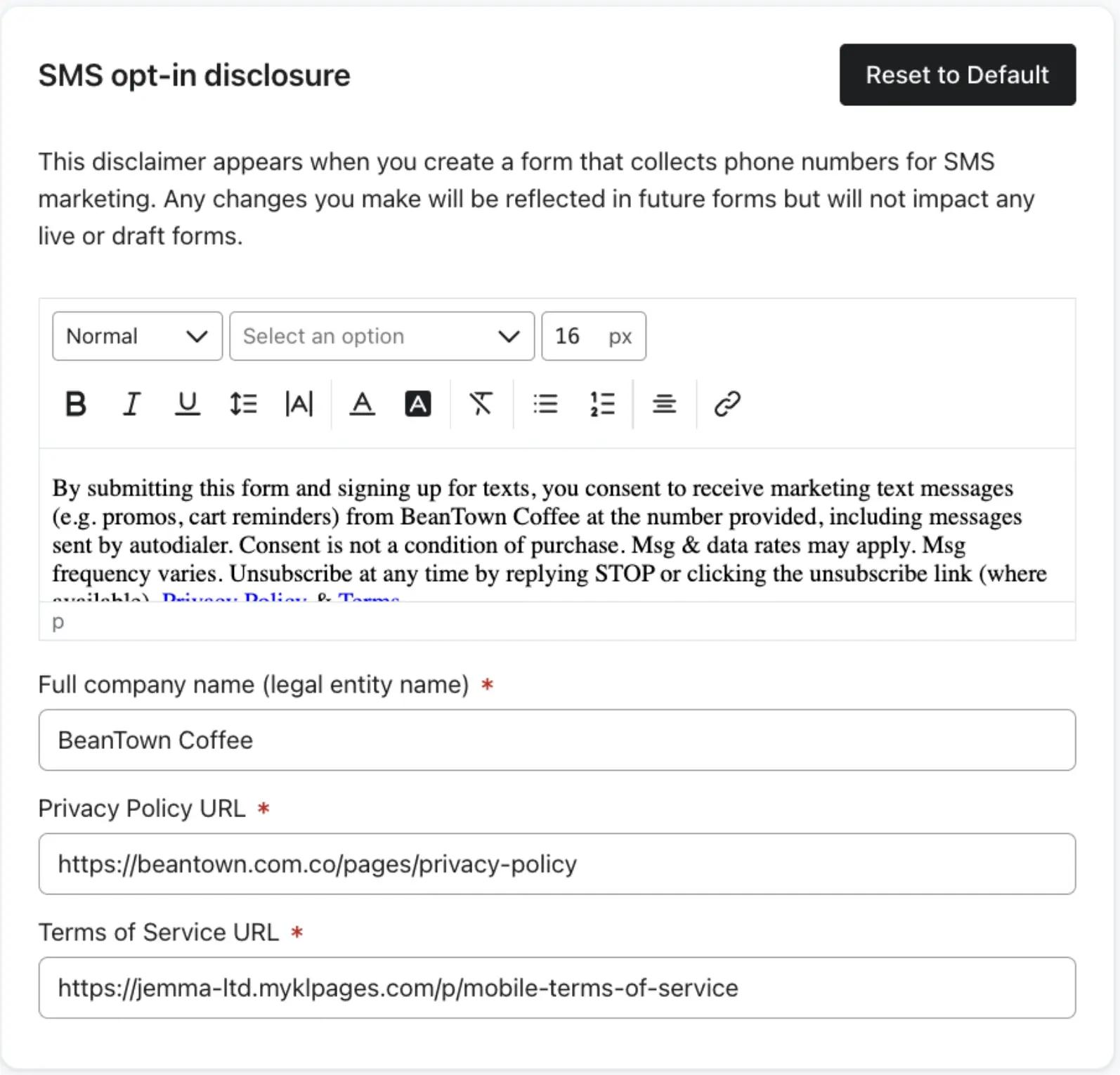 Your mobile TOS doesn’t need to be part of your normal TOS; it can be separate. What’s important is that you link to your mobile TOS anywhere you collect SMS consent, such as sign-up forms and at checkout. Learn how to create mobile terms of service in Klaviyo.