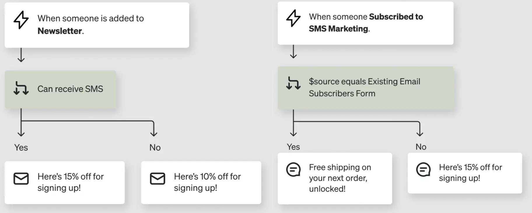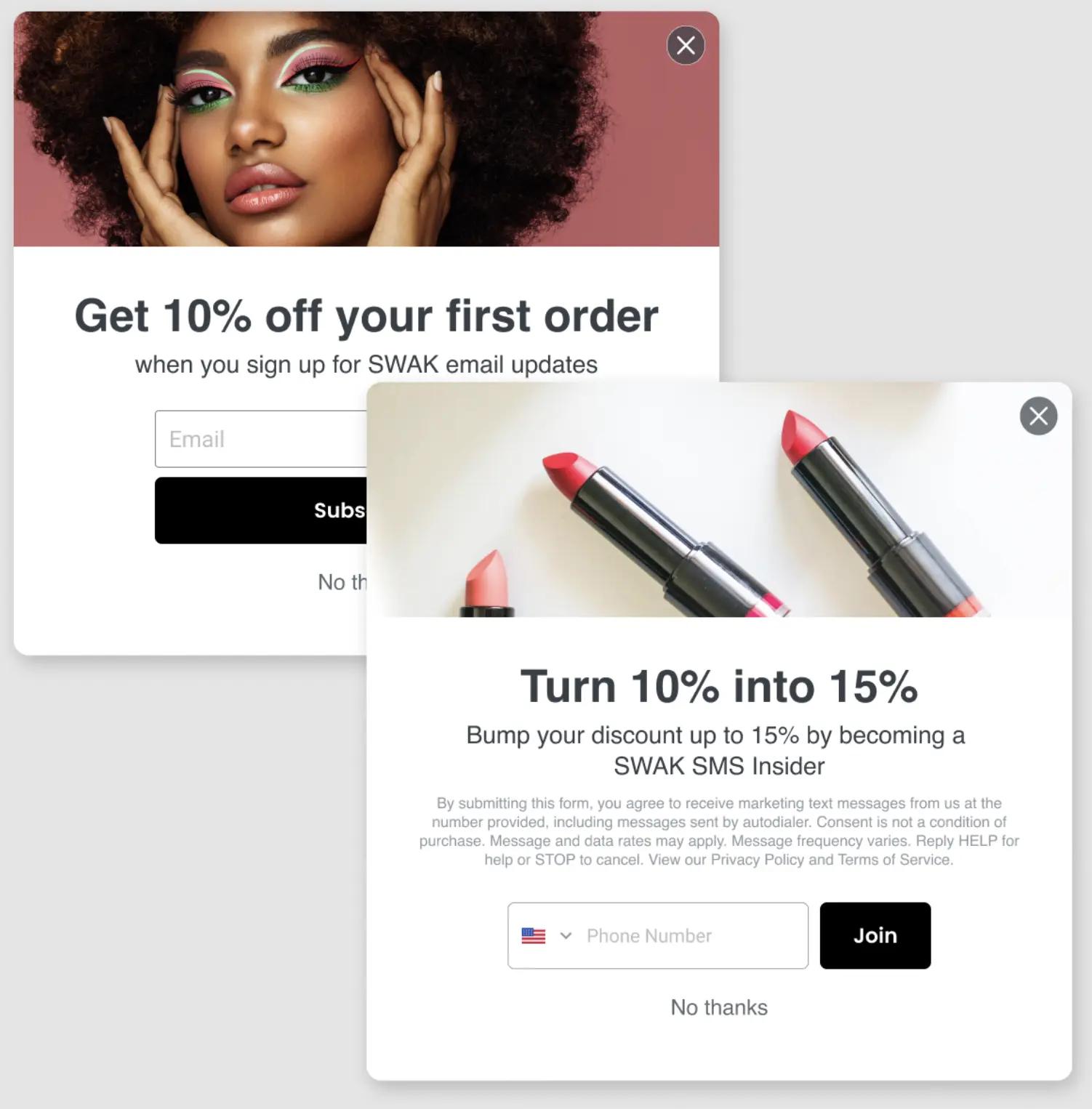 We recommend using a layered sign-up incentive to collect email and SMS consent. For example, offer 10% off for email sign-ups and an additional 5% off for SMS consent. This supports the idea that SMS is optional, but positions the channel as more valuable than email. We’ll cover how to deliver these stacked incentives later in the flows section of this guide.