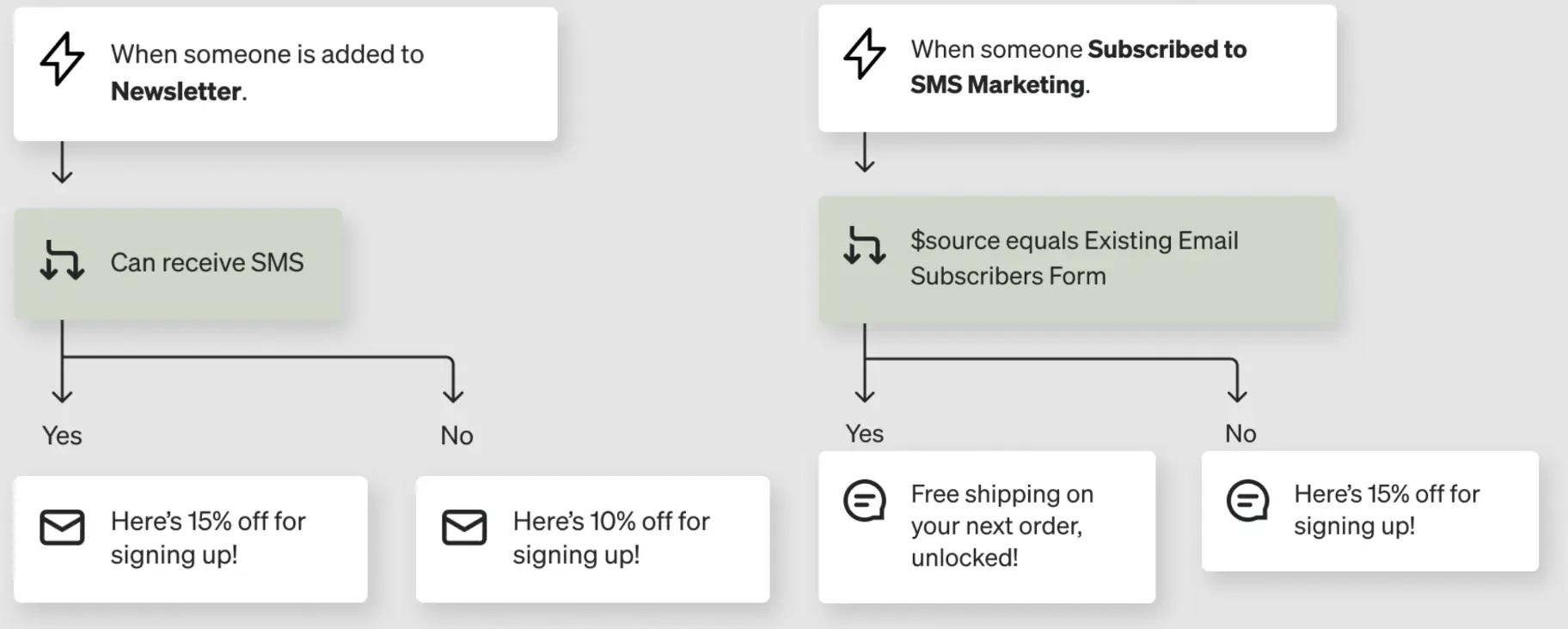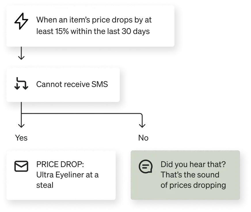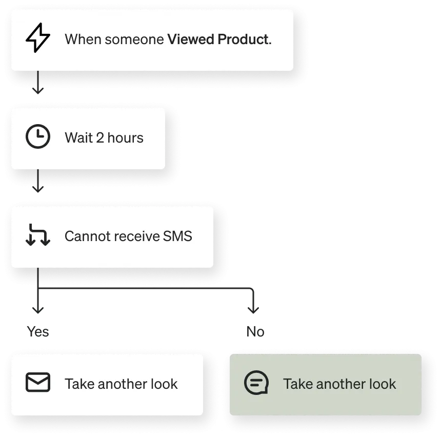 Keep the customer experience in mind and use SMS for time-sensitive messages that encourage subscribers to take a clear action. For these retention flows, you should test different configurations of email and SMS to see what works best with your customers. A/B test 2 flow branches: 1 where you lead with SMS and follow up via email, and 1 where you lead with email and follow up with an SMS.