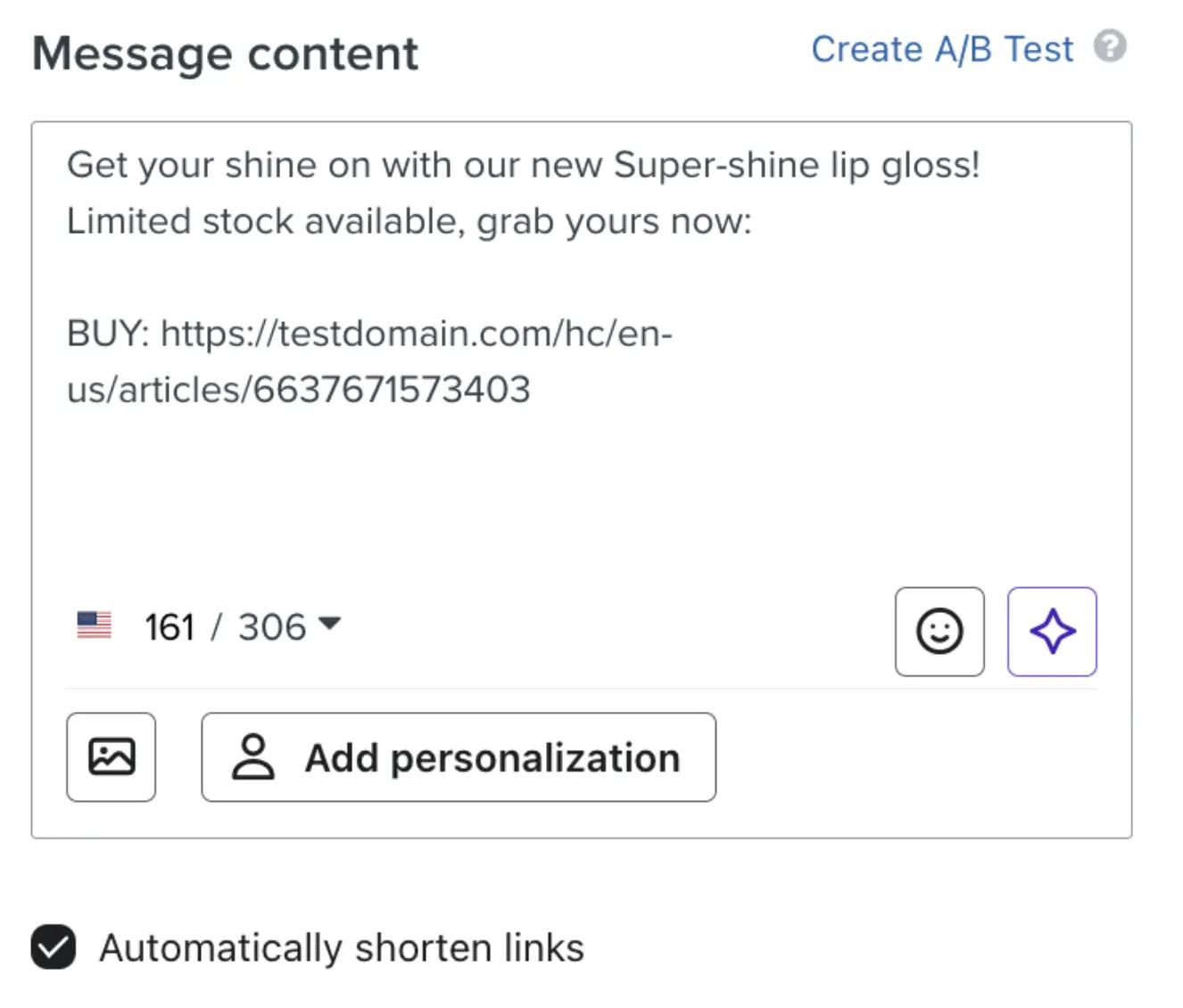 Our analysis of top-performing Klaviyo brands shows that shorter messages tend to drive higher click rates and more ROI. So keep it simple in your SMS campaigns. Use the built-in SMS AI feature to help you generate concise copy that encourages recipients to take the desired action.