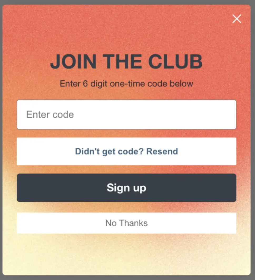 Configure Smart Opt-in on Klaviyo sign-up forms to remove friction from the SMS consent collection process. When a site visitor enters their phone number into your form, a 6-digit authentication code will be sent to their device. They then enter that code into the form to confirm their SMS subscription.