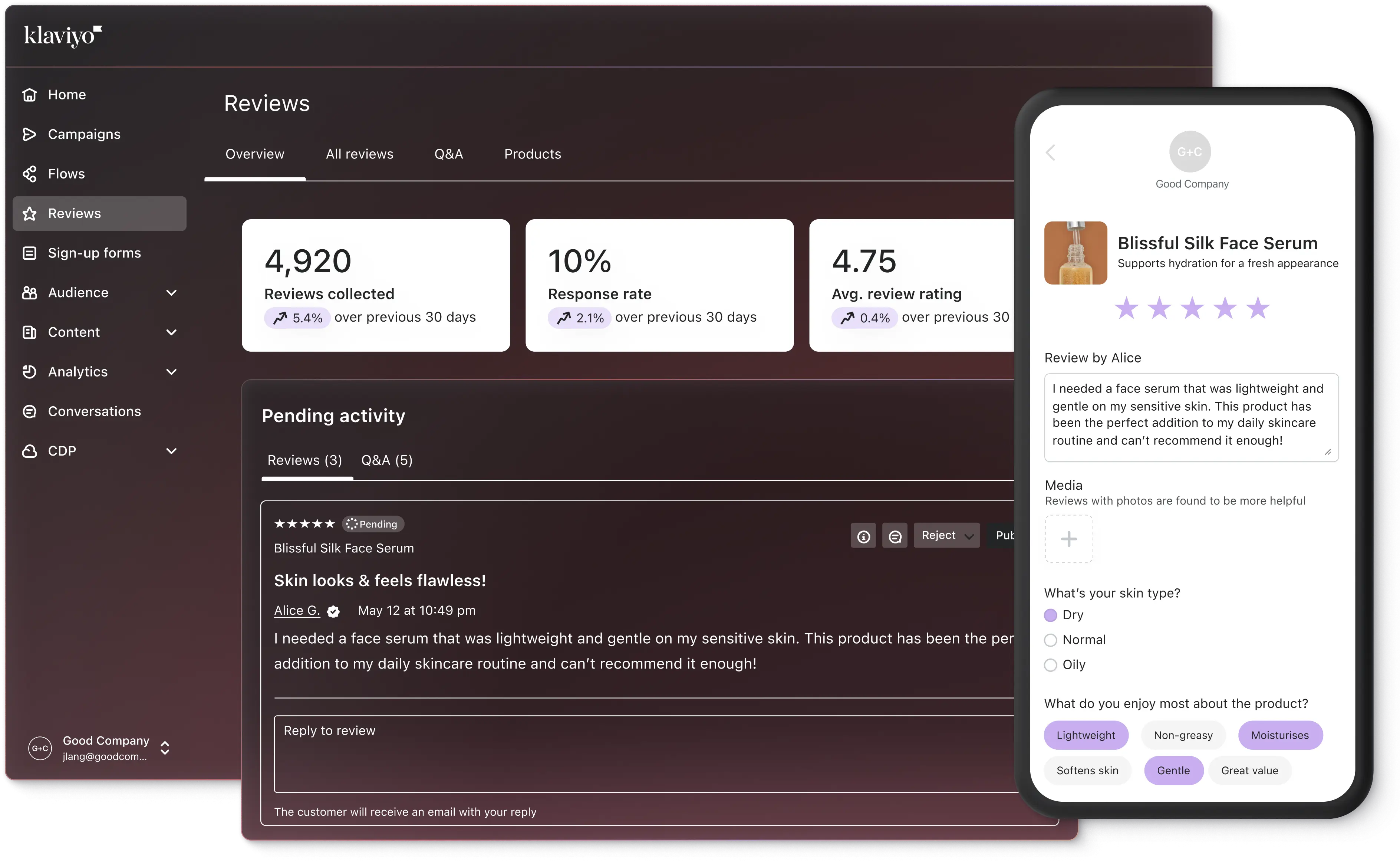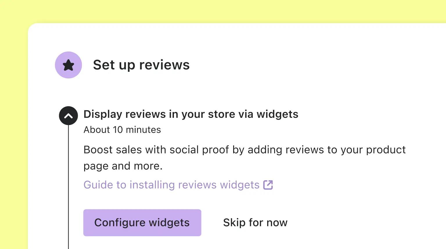 First, install the Klaviyo reviews app for Shopify. Then, you can add the reviews widgets to your store, customise flows in Klaviyo, and start collecting reviews.