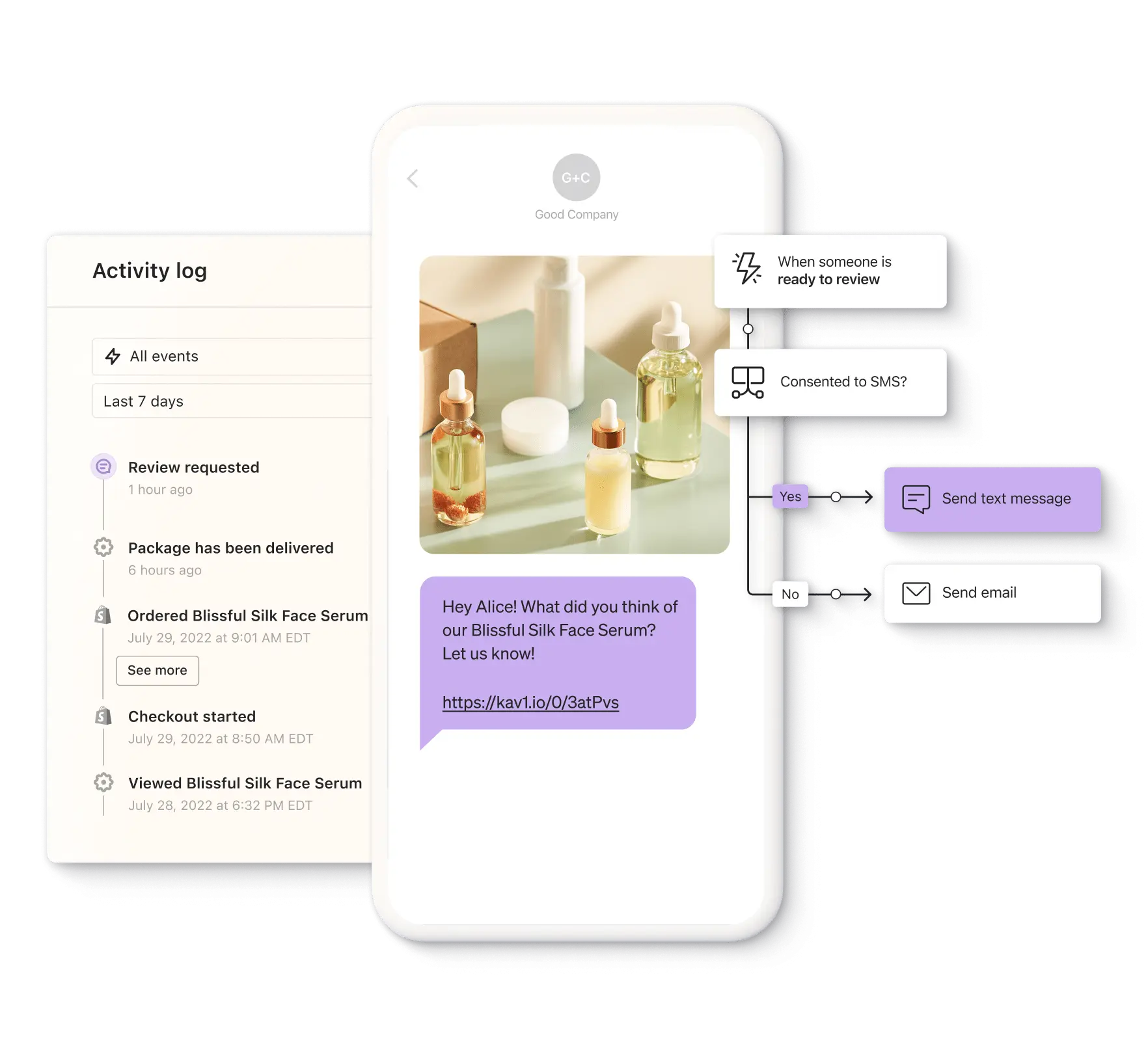 Use pre-built flows to send emails or texts when customers are eligible to leave a review.