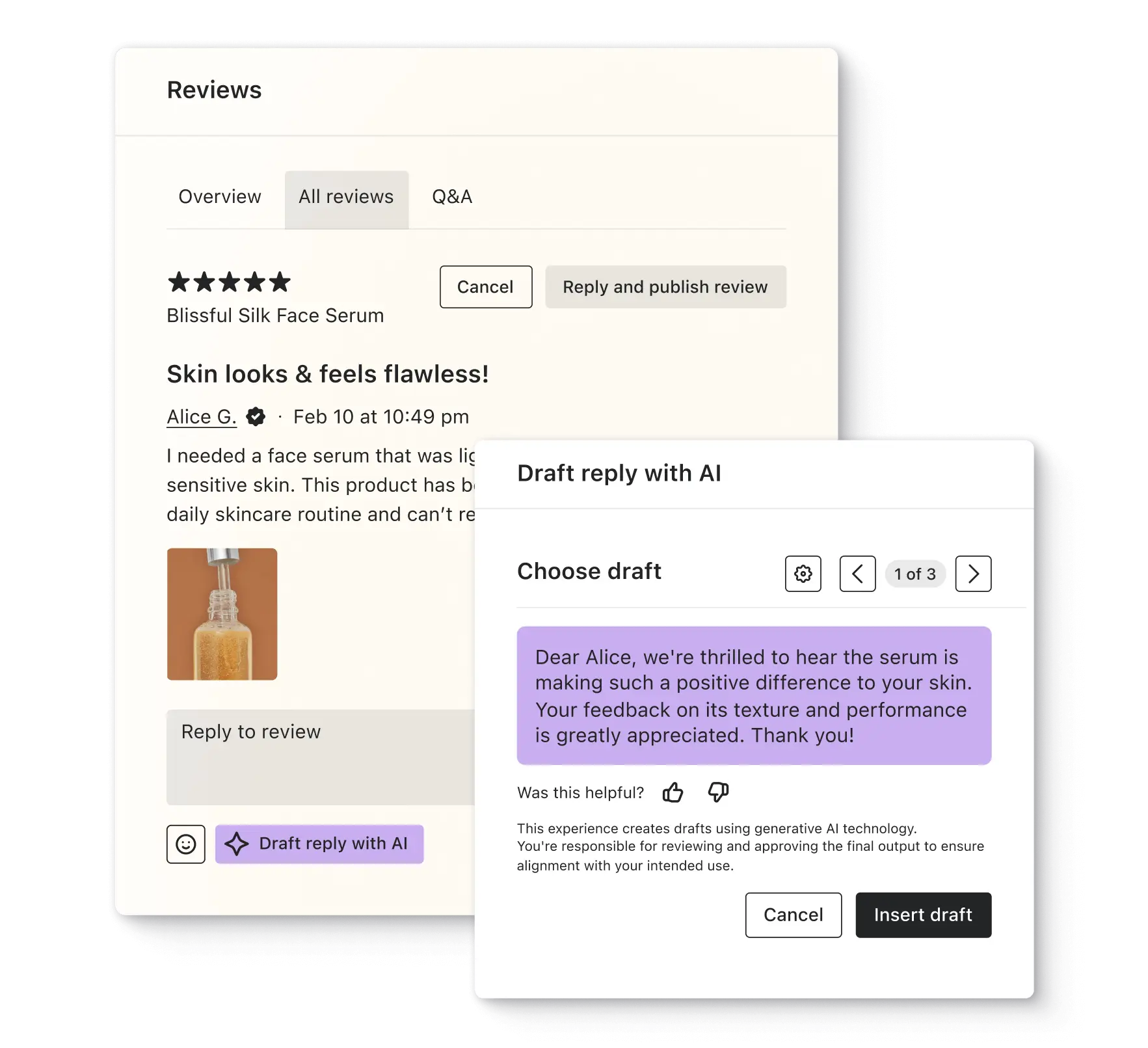 Encourage customers to submit their review faster with AI-suggested headlines. Use AI to quickly draft replies to reviews, automatically written in your brand’s tone and voice.