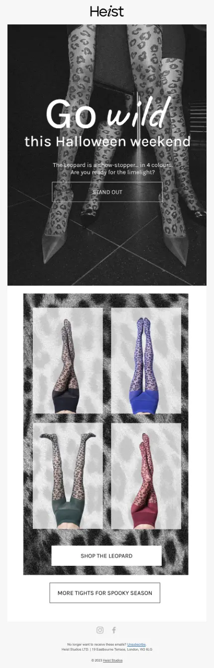 Heist, a fashion brand that specialises in women’s base layers, uses this Halloween email to launch a Halloween collection.