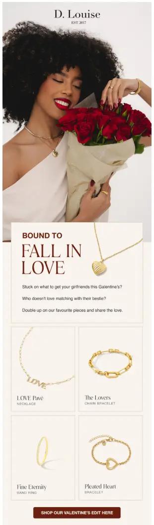 Take a look at this Galentine’s Day sale email from jewellery brand D. Louise, which earned a high click rate by incorporating: