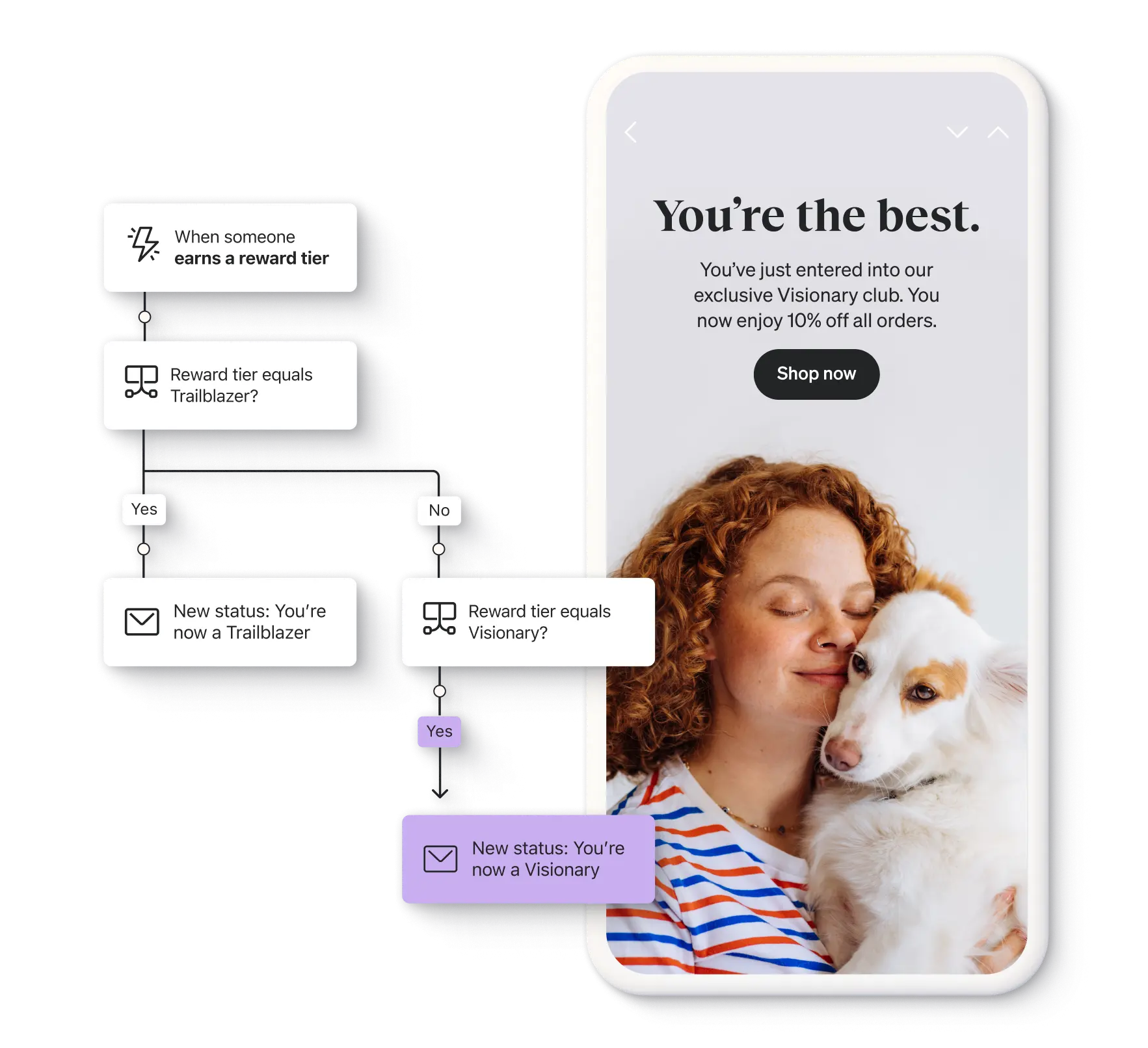 Create custom flows that trigger timely experiences in response to a subscriber action, event, or milestone of your choice. Then, you can build branching conditions (“split logic”) for more relevant customer journeys.