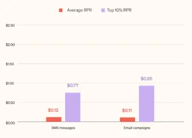 Average revenue per recipient (RPR) for SMS campaigns was slightly higher than email based on all ecommerce industries—which represents exciting things for marketers currently leading the way with this relatively new channel.