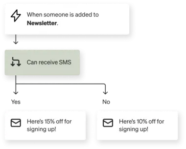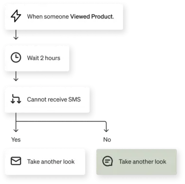 Keep the customer experience in mind and use SMS for time-sensitive messages that encourage subscribers to take a clear action. For these retention flows, you should test different configurations of email and SMS to see what works best with your customers. A/B test 2 flow branches: 1 where you lead with SMS and follow up via email, and 1 where you lead with email and follow up with an SMS.