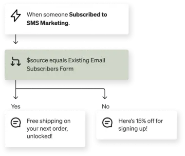 - Conditional split: Split the flow by the $source profile property to account for any difference in incentives that you might have between your “new visitor” form and “existing email” form. For instance, you may offer 15% off to new visitors for SMS consent, but free shipping to existing email subscribers if they sign up for SMS. Branching based on sign-up form source allows you to deliver on these different incentives within a single flow.